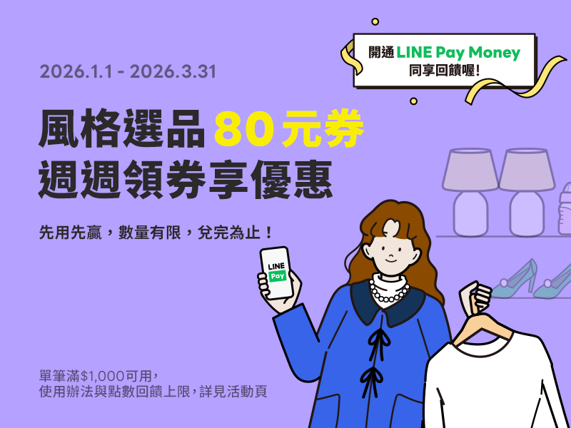 活動期間已註冊LINE Pay可週週到「領取優惠券」領<先用先贏>指定風格選品80元優惠券!