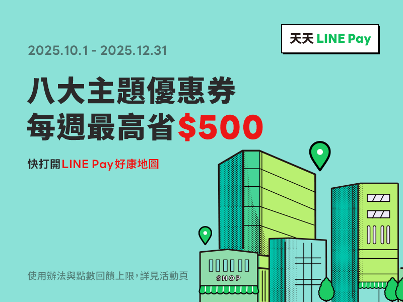 活動期間已註冊LINE Pay的用戶可週週到「好康地圖」領八大主題店家優惠券!