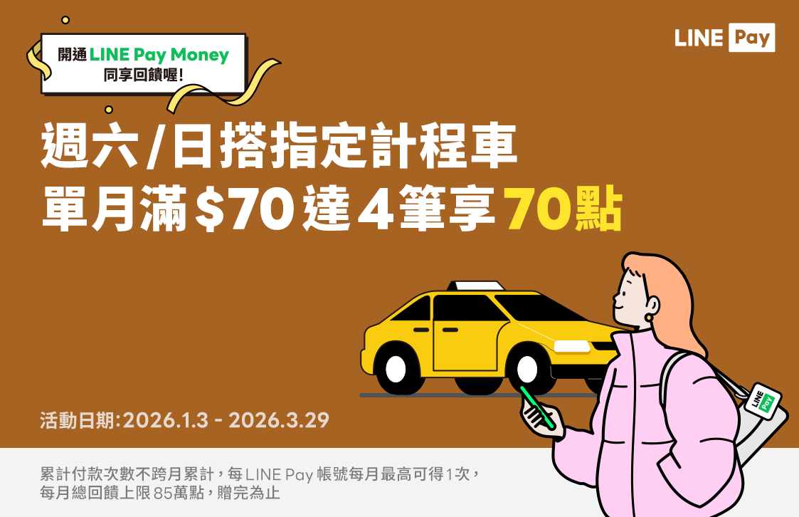 活動期間內的每週六及週日,已註冊LINE Pay的用戶搭乘台灣大車隊、yoxi或Uber,透過LINE Pay付款並選擇使用已綁定的任一發卡銀行信用卡或簽帳金融卡支付車資,單月累計4筆且4筆交易實際支付金額滿新台幣70元(LINE POINTS及優惠券折抵金額不計入),享LINE POINTS 70點回饋!