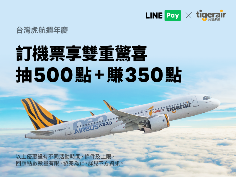 【台灣虎航】 週年慶LINE Pay付款單筆滿5,000元送紅包,抽最高500點!指定日期單筆滿萬再享350點回饋!