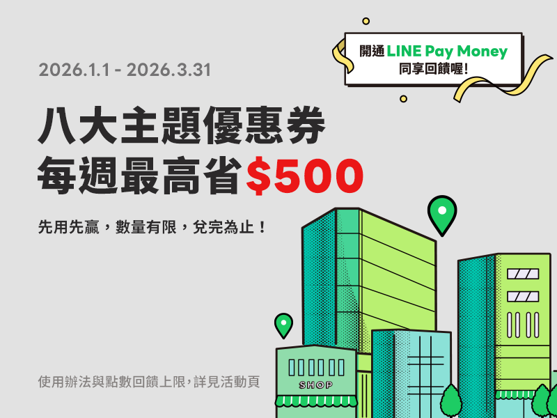 活動期間已註冊LINE Pay的用戶可週週到「好康地圖」領<先用先贏>八大主題店家優惠券!