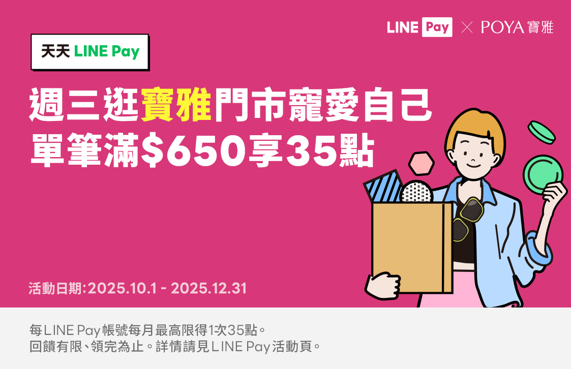 活動期間內的每週三已註冊LINE Pay的用戶於寶雅實體獨立門市現場消費,結帳時透過LINE Pay條碼並使用已綁定的任一發卡銀行卡片或LINE Pay Money帳戶付款,且單筆交易實際支付滿新台幣650元(LINE POINTS及優惠券折抵金額不計入),享LINE POINTS 35點回饋!