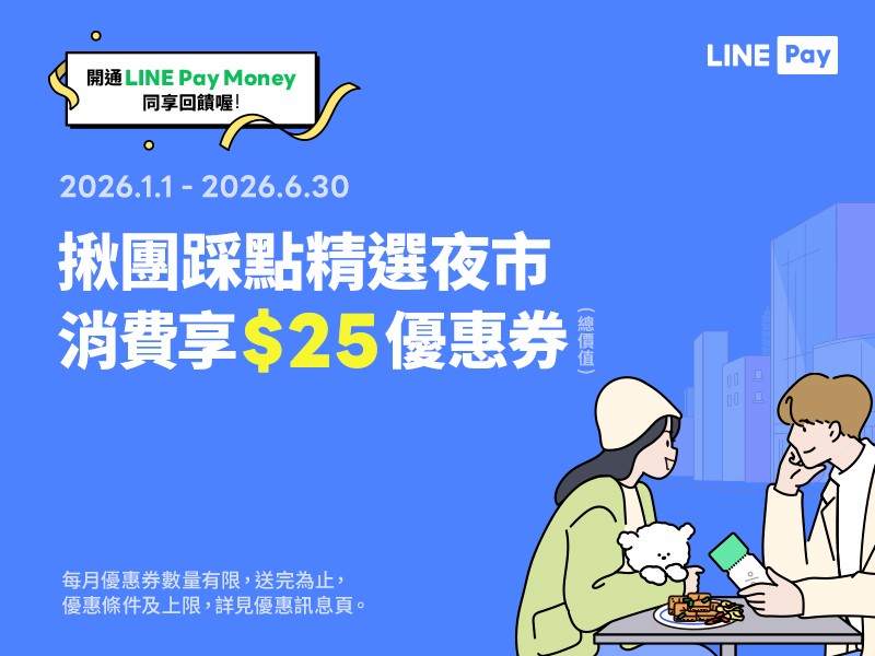 活動期間內已註冊LINE Pay的用戶於指定夜市店家現場消費,結帳時透過LINE Pay條碼或掃描付款(LINE POINTS及優惠券折抵不計入)享5張5元優惠券!