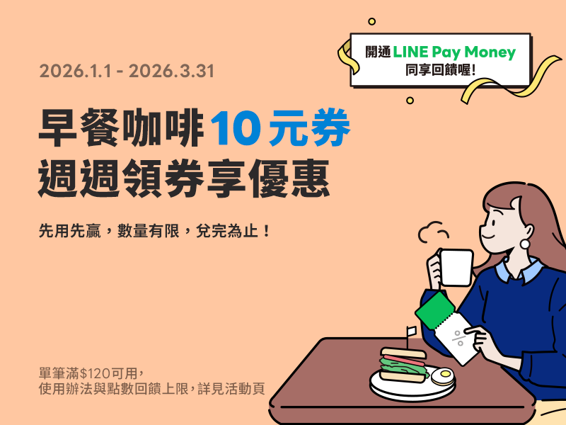 活動期間已註冊LINE Pay可週週到「好康地圖」領<先用先贏>指定早餐咖啡店10元優惠券!
