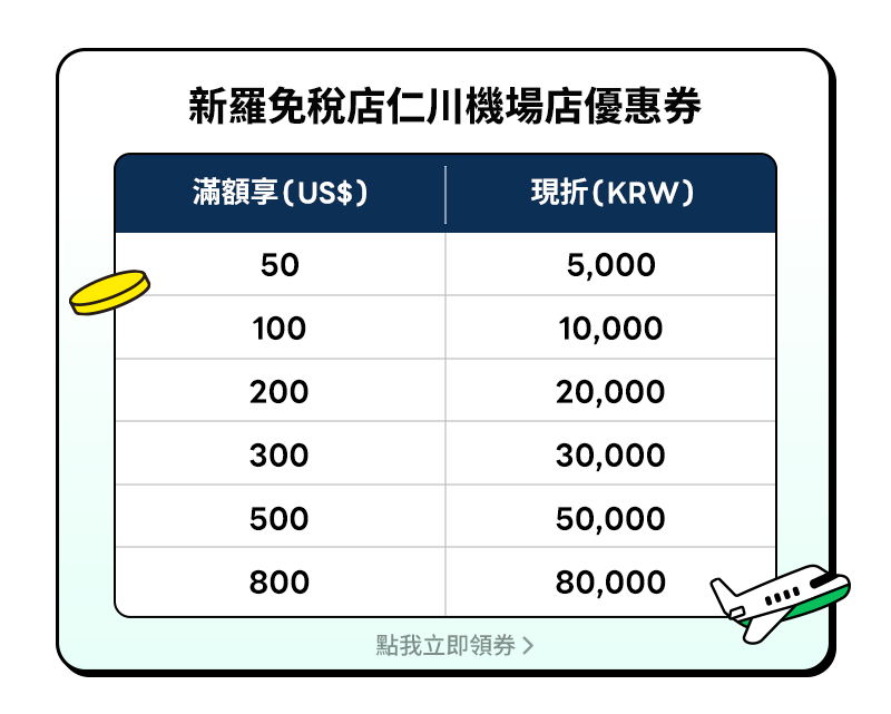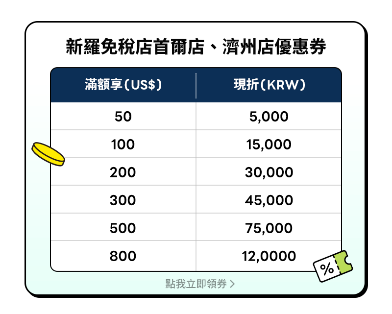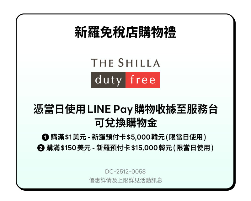 - 新羅免稅店各分店優惠券活動門檻及折抵面額不同,詳閱優惠券說明。