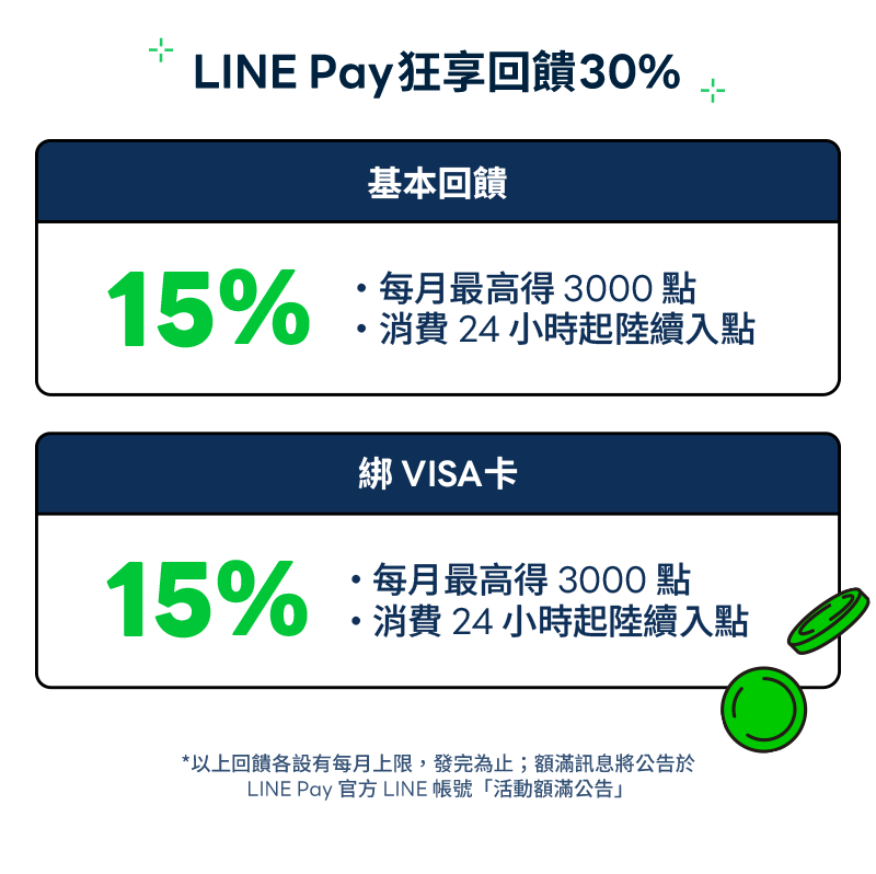 - [優惠二] 使用LINE Pay綁定富邦J卡再享10%回饋(包含原卡權益3%+活動加碼7%)