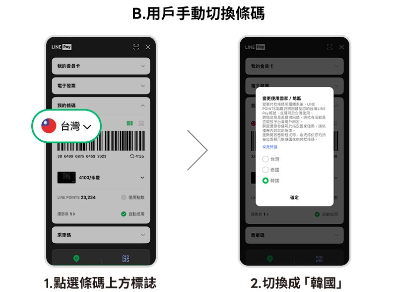 *如您已允許 LINE App 取用位置,且已開啟 LINE Pay 主頁設定中的 「定位服務」,系統將對應您的所在位置,自動切換成韓國版付款條碼。